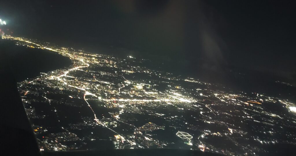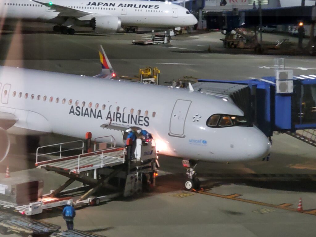 今回はANAマイルを使い提携航空会社のアシアナ航空を利用しました。アシアナ航空は12月に大韓航空と合併し子会社化されますのでアシアナ航空として利用するのは今回の旅行が最後となると思います。仁川国際空港までは約2時間ほどで着きますが機内食が出ます。ご飯に韓国風のちょっと辛めのソースが付いたチキンや野菜がのっていました。お腹は一杯でしたがおいしかったので全部食べれました。すっかり暗くなっており上空から日本や韓国の夜景を楽しんでいるとあっという間にソウルに着きます。韓国は近いので飛行機での移動は国内旅行と変わらない感覚ですね。仁川国際空港はさすがに大きくて、人も多くセントレアとは比べものにならないくらい賑わっています。