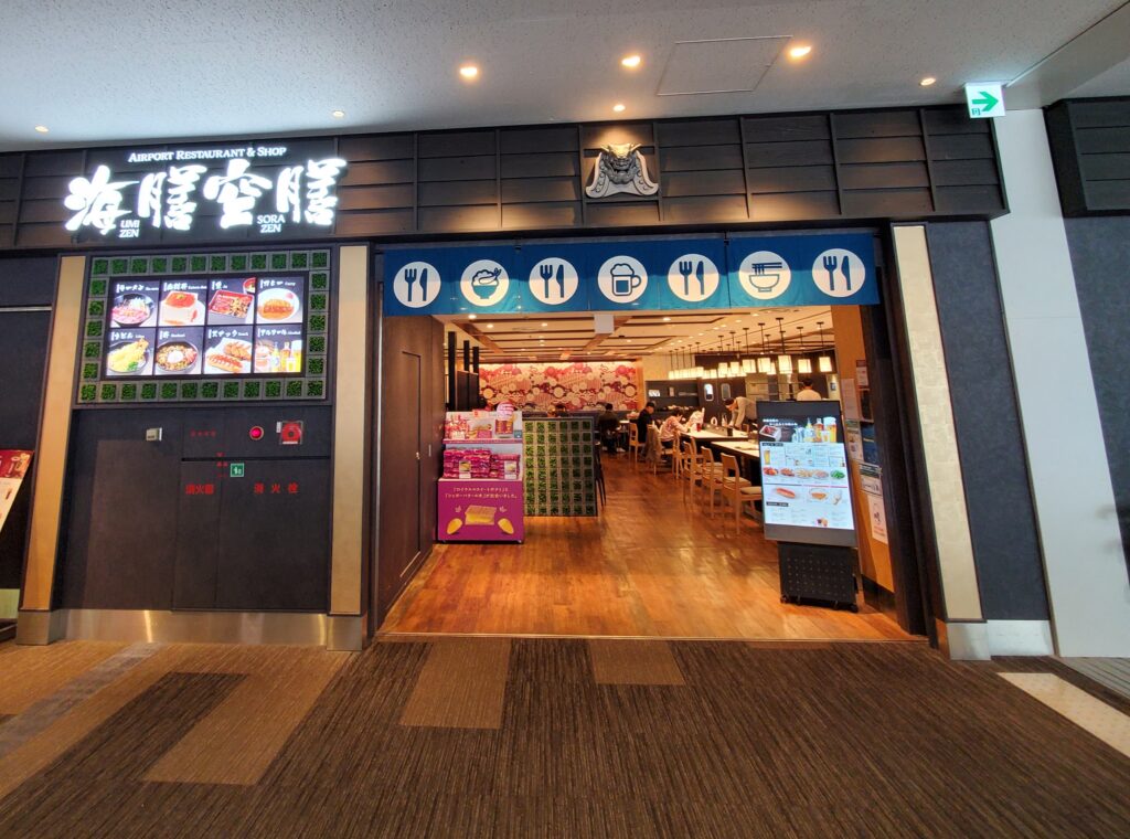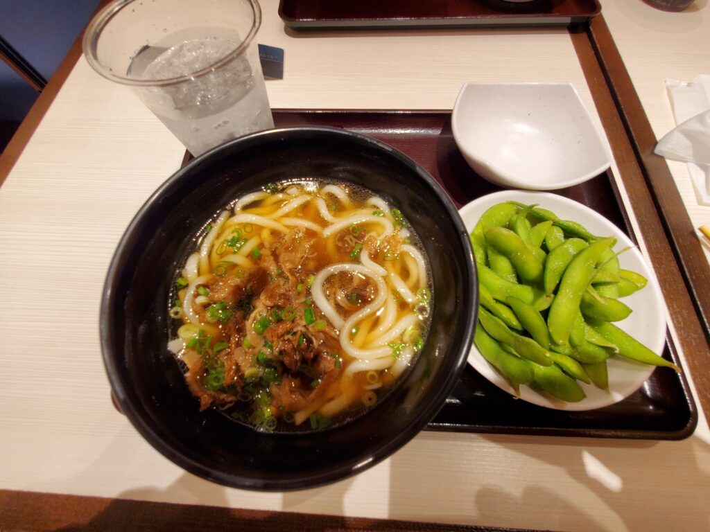 その後レストラン「海膳空膳」に行きました。プライオリティ・パス専用のメニューがありドリンクメニューとフードメニュー2品を選べます。先ほどラウンジで結構食べたので軽めで肉うどんと枝豆にしました。ドリンクは60分間のフリードリンクとなります。ビールはさっき何杯も頂いたのでここではレモンサワーを1杯だけいただきました。